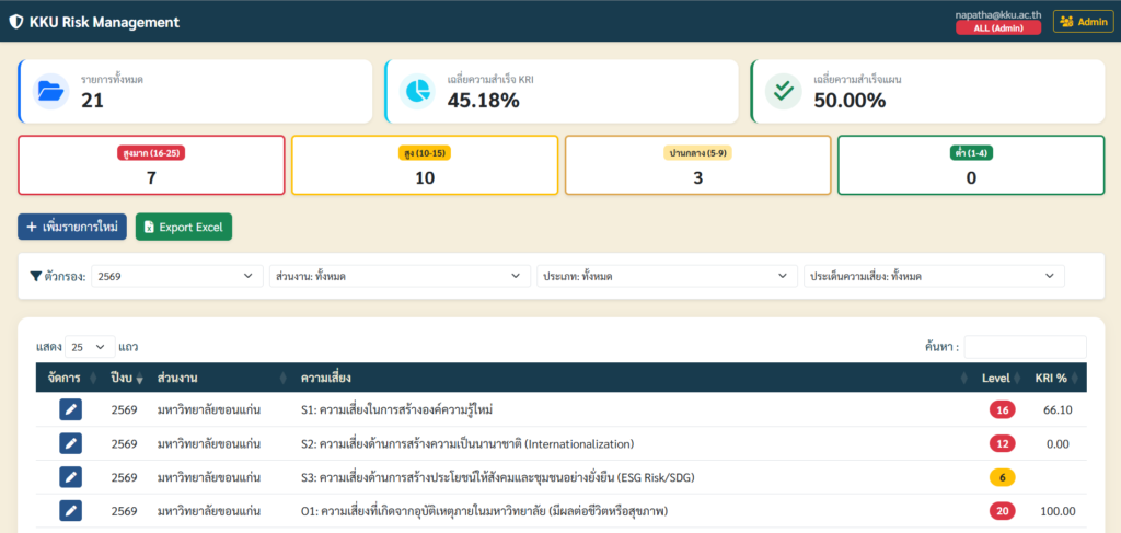 เมื่อวันที่ 6 กุมภาพันธ์ 2569 เวลา 13.30 – 15.30 น. ณ ห้องประชุมสารสิน ชั้น 2 อาคารสิริคุณากร กองยุทธศาสตร์ สำนักงานอธิการบดี ได้จัดการประชุมชี้แจงวิธีการนำเข้าข้อมูลแผนและการรายงานผลการบริหารความเสี่ยง ประจำปีงบประมาณ พ.ศ. 2569 ร่วมกับผู้ปฏิบัติงานที่เกี่ยวข้องด้านการบริหารความเสี่ยงในสังกัดส่วนงาน และรวมถึงหน่วยงานผู้รับผิดชอบการรายงานผลการบริหารความเสี่ยงระดับมหาวิทยาลัย โดยกองยุทธศาสตร์ได้ดำเนินการพัฒนาระบบการบริหารความเสี่ยง (KKU Risk Management) โดยการนำเทคโนโลยีดิจิทัลมาใช้ในการกำกับติดตามผลการบริหารความเสี่ยงของมหาวิทยาลัยขอนแก่น เพื่อให้การบริหารงานของมหาวิทยาลัยเป็นไปตามหลักธรรมาภิบาล สามารถติดตามประเมินผลตามแผนการบริหารความเสี่ยงได้อย่างมีประสิทธิภาพ
