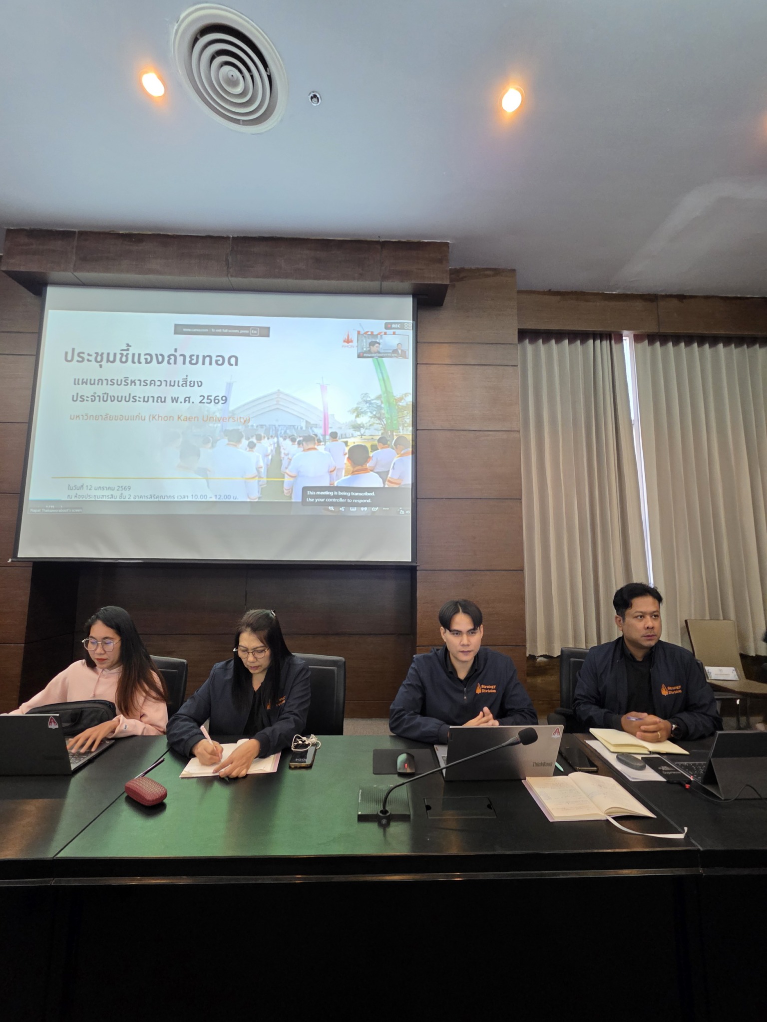 เมื่อวันที่ 12 มกราคม 2569 เวลา 10.00 – 12.00 น. ณ ห้องประชุมสารสิน มหาวิทยาลัยขอนแก่น กองยุทธศาสตร์ สำนักงานอธิการบดี ได้จัดการประชุมชี้แจงถ่ายทอดแผนการบริหารความเสี่ยง ประจำปีงบประมาณ พ.ศ. 2569 มหาวิทยาลัยขอนแก่น โดยมี รศ.นพ.ชาญชัย พานทองวิริยะกุล อธิการบดี เข้าร่วมเปิดการประชุม โดยมีผู้บริหารมหาวิทยาลัย ผู้บริหารส่วนงาน ผู้ปฏิบัติงานและเจ้าหน้าที่ที่เกี่ยวข้อง จำนวนกว่า 52 คน เข้าร่วมในห้องประชุมสารสิน และอีกกว่า 70 คน เข้าร่วมผ่านระบบการประชุมทางไกล (VDO Conference)